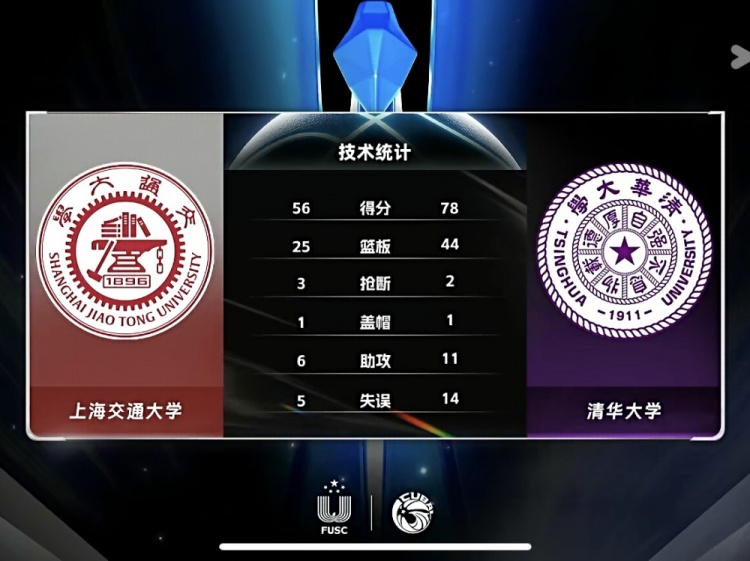 比赛开始,清华大学比较慢热,打了4分钟才靠造杀伤拿得首分,上海交大则是打出8-2开局,双方进攻端状态都很慢热,刘冠男2+1后石奎回应三分,首节上海交大领先2分,次节双方命中率还不是很高,清华大学接连3记三分咬住比分,石奎苦苦支撑,顿家威和吴泽昊撑起上海交大进攻,半场上海交大领先5分。下半场,杨曦皓接连外线3记三分,个人连砍12分帮助清华大学建立主动权,随后杨曦皓又接连扔进三分,清华大学单节36-11直接拉开20分领先,末节上海交大止血但隰泰诚里突外投回应,杨曦皓三分还能进,清华大学牢牢掌握住20分以上领先,最终清华大学78-56大胜上海交大。
