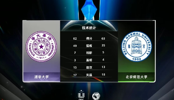 末节比赛,清华大学的命中率出现下降,前四分钟的时间里只拿到两分,北京师大则是两记三分缩小分差,比赛最后一分钟,张子涵命中追平三分,冯灏上篮更是帮助北京师大完成反超,吴语桐关键两罚只命中一个未能扳平比分,最终北京师大63-62险胜清华大学挺进决赛。