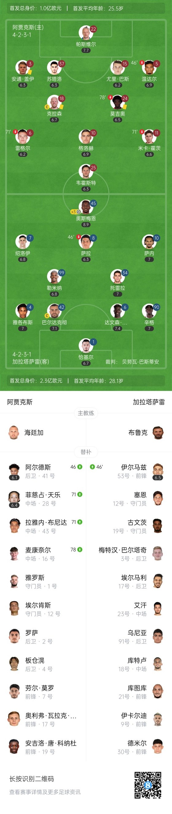 下半场补时5分钟,阿贾克斯0-3加拉塔萨雷。