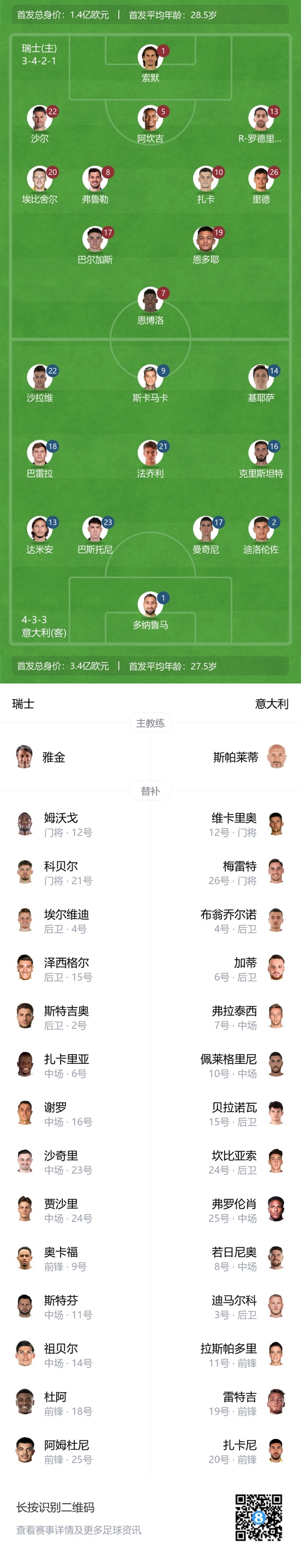 瑞士首发及换人: