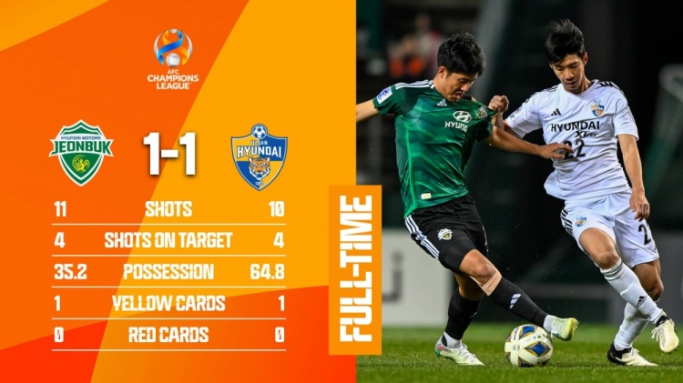 3月5日讯 北京时间3月5日晚上18:00,亚冠1/4决赛首回合,全北现代主场迎战蔚山HD,东亚区的另一场1/4决赛是山东泰山vs横滨水手,首回合比赛时间3月6日18点,这两组对决的胜者将在半决赛中相遇。上半场,宋旻揆3分钟包抄破门,蒂亚戈失点。下半场,李明载冷静扳平。全场结束,全北现代1-1蔚山HD。双方次回合的较量将在3月12日晚上18:00进行,蔚山HD主场。
