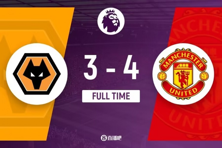 下半场伤停补时9分钟,全场比赛结束,最终曼联4-3狼队。