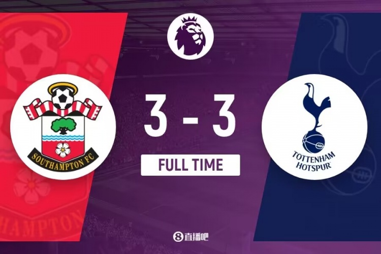 下半场伤停补时5分钟,全场比赛结束,最终热刺3-3南安普顿。