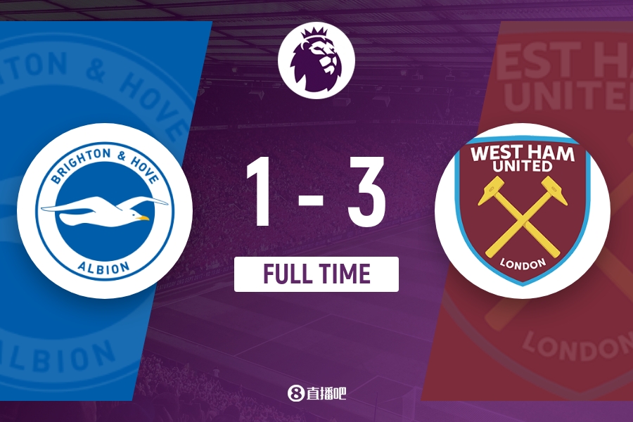 全场比赛结束,布莱顿1-3西汉姆。