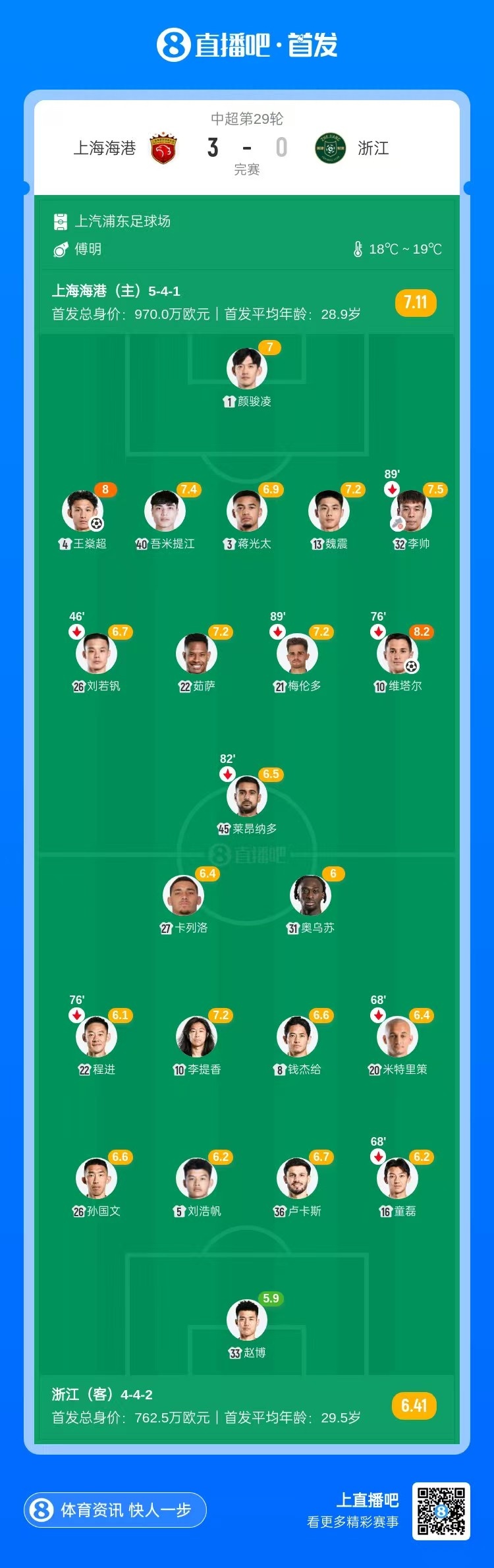 全场比赛结束,上海海港3-0浙江。