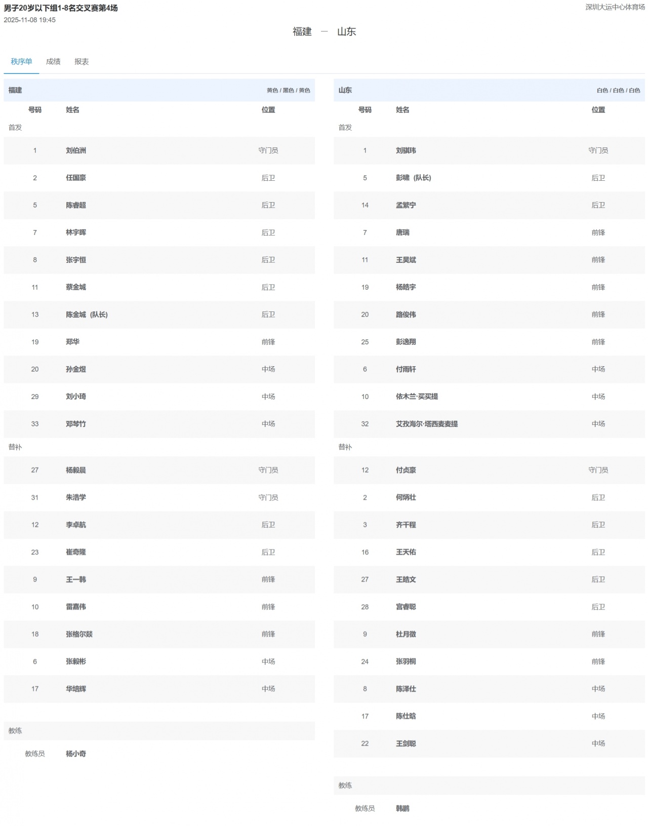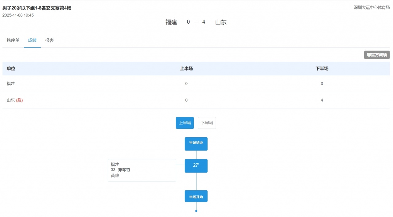 11月08日讯 全运男足U20 1/4决赛,山东U20以4-0淘汰福建U20晋级8强,将会在4强对阵湖北U20。本场比赛,路俊伟(49')、彭啸(67')、杜月徵(77')为山东U20进球,张格尔燚(88')乌龙。