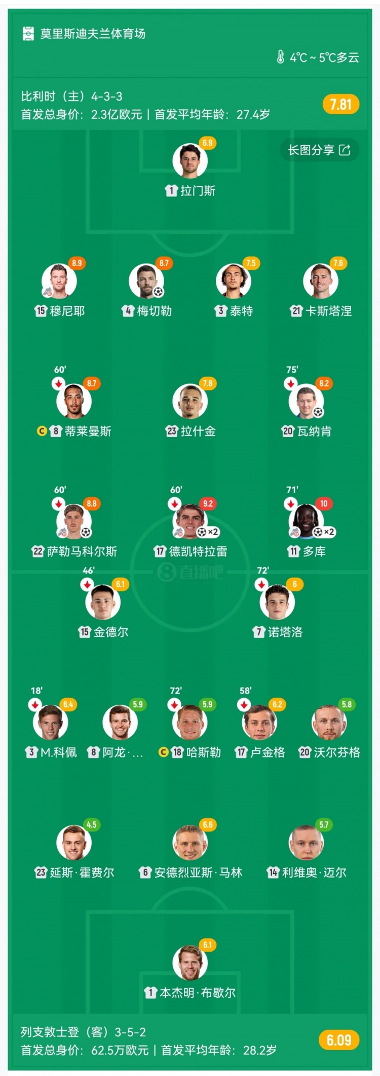 第55分钟,比利时前场高压逼抢断球后远射被扑,门前萨勒马科尔斯补射进球,比利时5-0领先↓