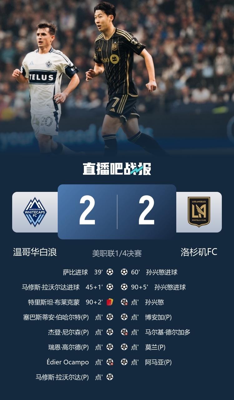 11月23日讯 美职联1/4决赛,温哥华白浪坐镇主场不列颠哥伦比亚体育场对阵洛杉矶FC。上半场温哥华凭借萨比和拉沃尔达的进球2球领先,孙兴慜下半场双响帮助洛杉矶扳平,加时赛双方再无建树。最终,十人温哥华6-5取胜(点球大战4-3),成功晋级美职联季后赛西部决赛,对手将是圣地亚哥和明尼苏达联的胜者。