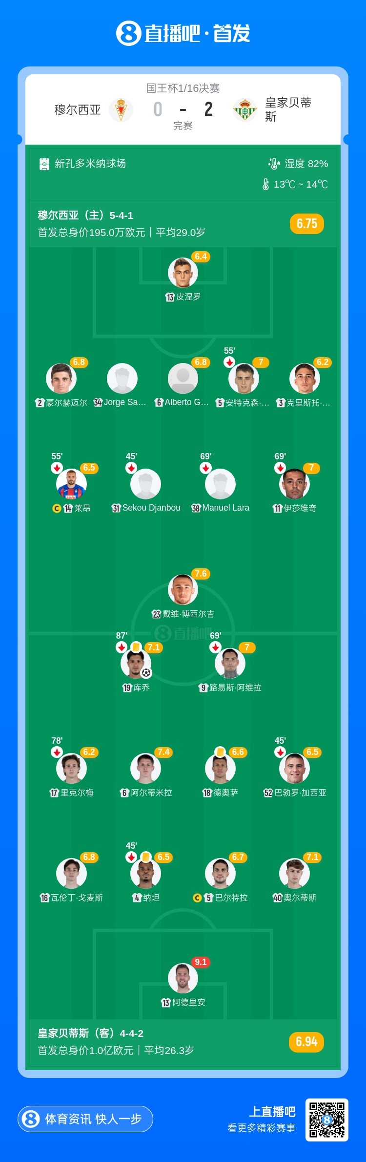第30分钟,库乔禁区前起脚射门,皮球击中对手手臂!主裁判判罚点球!库乔亲自主罚命中,贝蒂斯1-0领先穆尔西亚↓