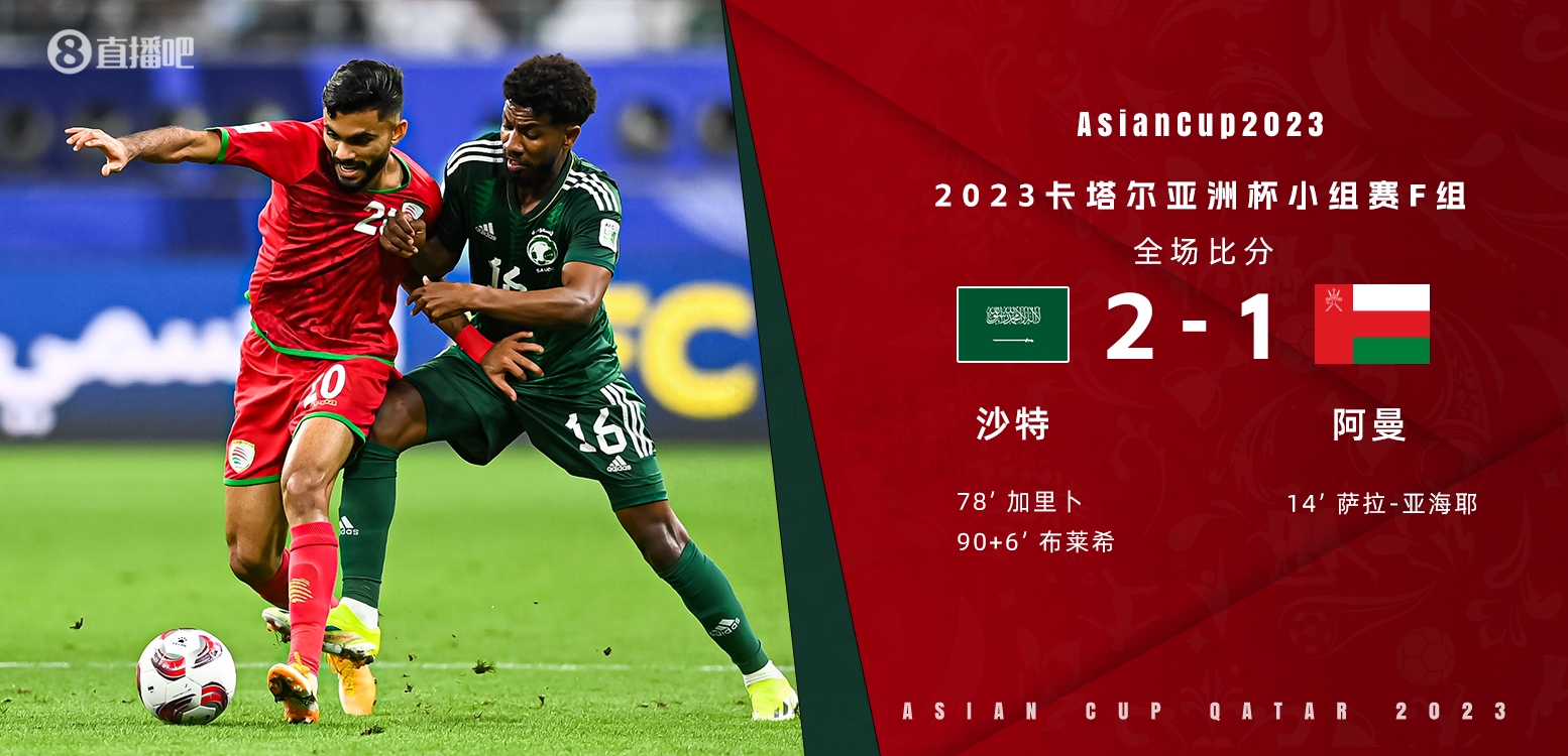 1月17日讯北京时间1月17日凌晨1:30,亚洲杯小组赛F组第一轮,沙特对阵阿曼。上半场,阿尔坦巴克蒂踩倒加萨尼送点,亚海耶主罚点球命中为阿曼取得领先;半场战罢,沙特暂0-1阿曼;下半场,加里卜一条龙破门扳平比分,布莱希补时头球破门上演绝杀。全场比赛结束,沙特2-1阿曼。