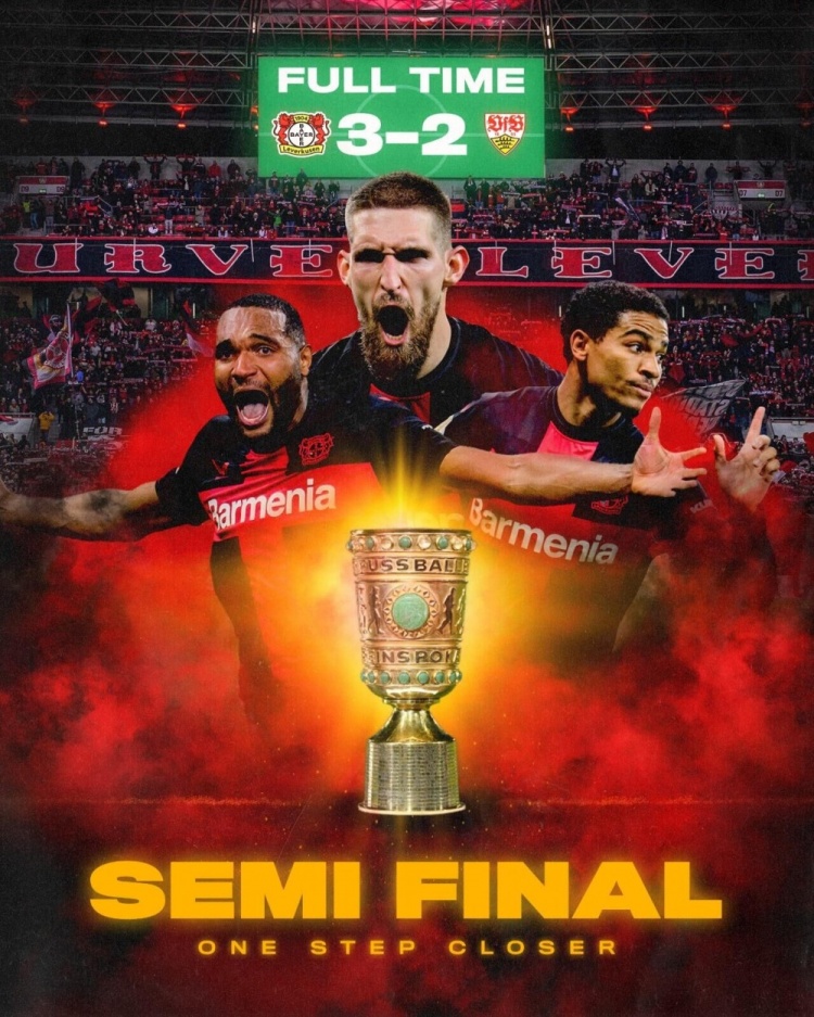 2月7日讯 德国杯1/4决赛,勒沃库森主场迎战斯图加特。上半场斯蒂勒角球助攻安顿先拔头筹,希克补射破门但越位在先进球无效。易边再战,安德里希世界波扳平,弗里希再次为斯图加特取得领先,替补登场的阿德利单刀再次扳平,最后时刻维尔茨助攻塔头槌绝杀。最终勒沃库森3-2斯图加特晋级四强。