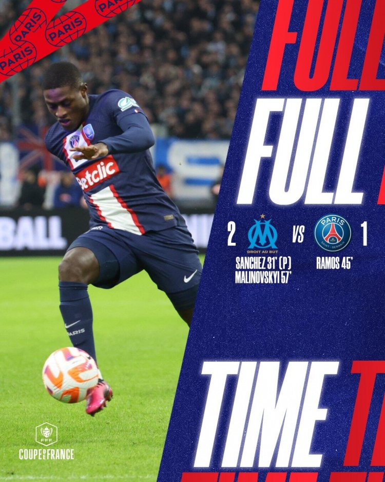 2月9日讯 北京时间2月9日凌晨4时10分,法国杯八分之一决赛,巴黎客场对阵马赛。上半场,桑切斯点射首开纪录,拉莫斯扳平比分。巴黎半场1-1战平马赛。下半场,马利诺夫斯基打进一球。最终巴黎1-2不敌马赛,止步法国杯16强。