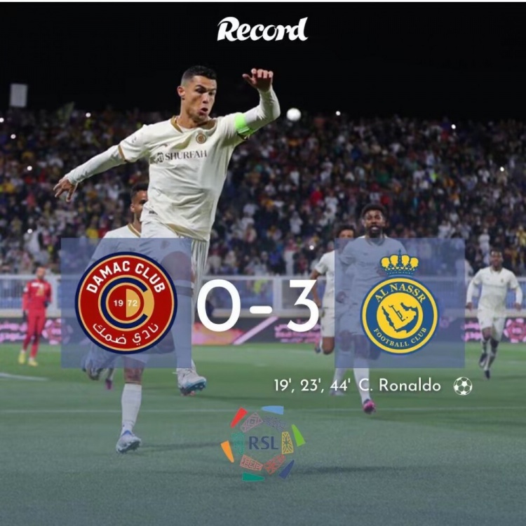 第44分钟,利雅得胜利反击,加里卜左路带球推进后送出传球,叶海亚得球横传中路,C罗跟上推射破门上演帽子戏法,利雅得胜利暂3-0达马克。↓