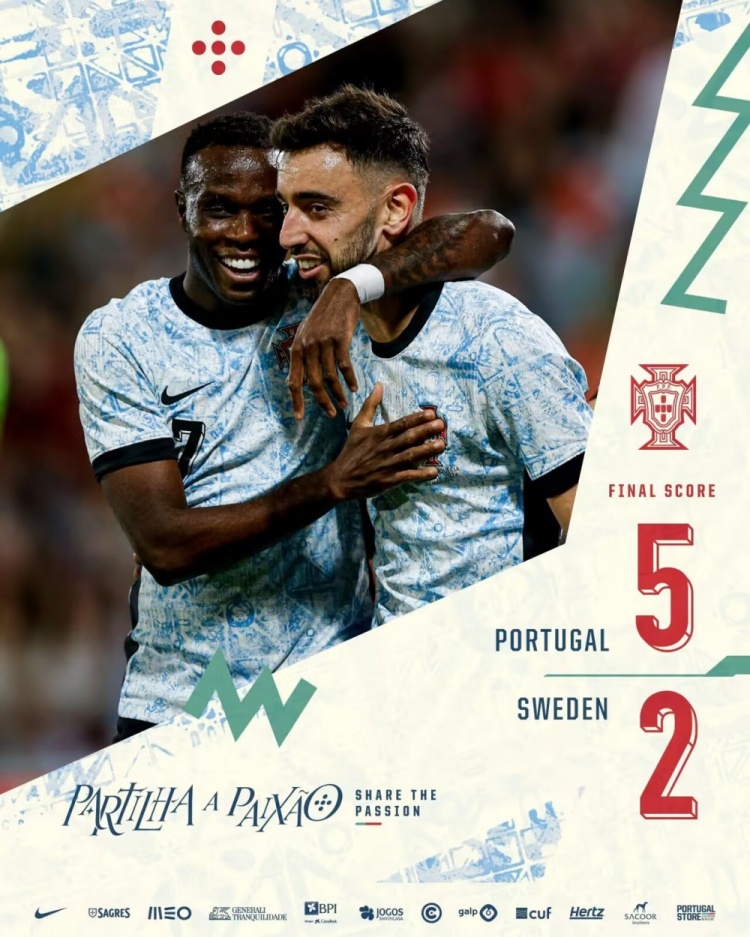 3月22日讯 北京时间3月22日凌晨3:45,国际足球友谊赛,葡萄牙对阵瑞典,本场比赛C罗缺席。上半场B席中柱,莱奥补射破门,随后努内斯建功,塞梅多助攻B费再进一球,葡萄牙暂3-0瑞典;下半场B费助攻布鲁马破门,于厄克雷斯为瑞典扳回1球,塞梅多助攻贡萨洛-拉莫斯为葡萄牙再下一城,第90分钟尼尔松进球,最终葡萄牙5-2瑞典,各项赛事11连胜。