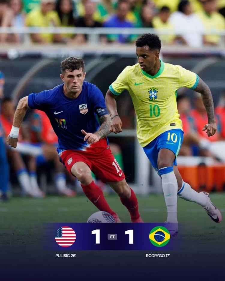 6月13日讯 北京时间6月13日7:00,国际足球友谊赛,巴西对阵美国。上半场穆萨射中横梁,拉菲尼亚助攻罗德里戈破门,普利西奇制造任意球并罚进,巴西暂1-1美国;下半场两队均无建树,最终巴西1-1战平美国。6月25日9:00,美洲杯小组赛D组第一轮,巴西将对阵哥斯达黎加。