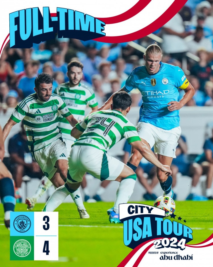 7月24日讯 北京时间7月24日早上7:30,曼城与凯尔特人进行一场友谊赛。上半场,尼古拉斯破门,鲍勃扳平,尼古拉斯再下一城,古桥亨梧单刀赴会。下半场,佩罗内闪击,哈兰德扳平,路易斯推空门。全场结束,曼城3-4凯尔特人。