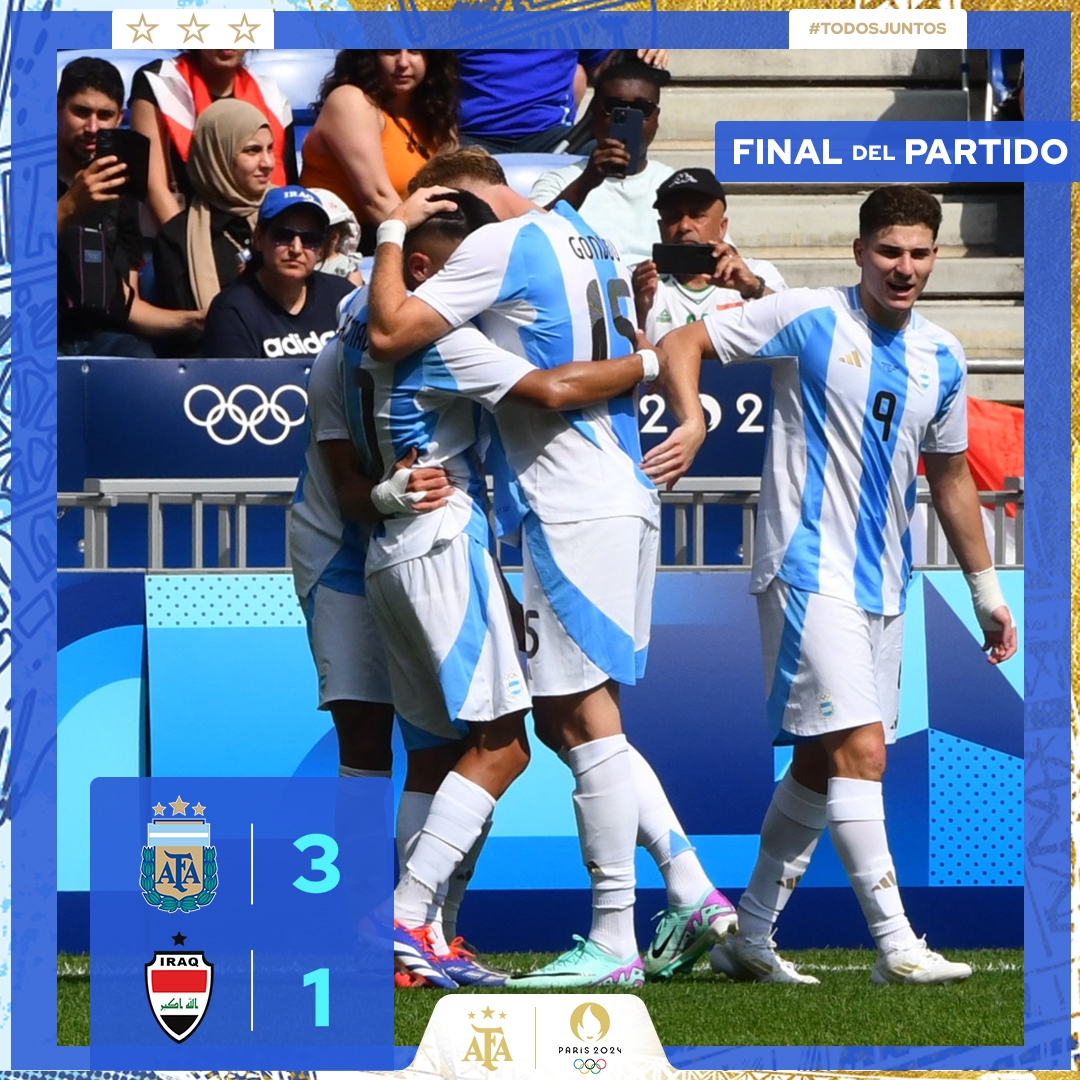 7月27日讯 北京时间7月27日晚21时整,2024年巴黎奥运男足小组赛B组第2轮展开角逐,阿根廷国奥对阵伊拉克国奥。上半场阿尔马达首开记录,阿尔瓦雷斯助攻,阿根廷半场补时再丢球,下半场贡多替补2分钟破门,埃兹奎尔-费尔南德斯世界波锁定胜局。最终阿根廷国奥3-1击败伊拉克取赛事首胜,阿根廷末轮将对阵此前小组垫底的乌克兰。B组积分榜方面,阿根廷积3分先赛暂升榜首,伊拉克积3分跌至第3。