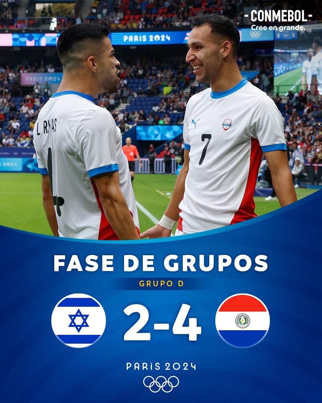07月28日讯 奥运男足D组第二轮,以色列vs巴拉圭。上半场M-费尔南德斯破门,下半场甘德尔曼扳平,之后恩西索、格洛克为两队各入一球。补时阶段,巴尔布埃纳和M-费尔南德斯为巴拉圭连入两球,最终巴拉圭4-2取胜。
