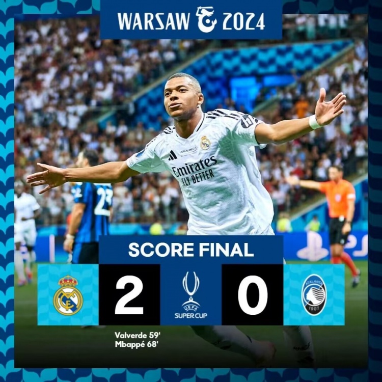 8月15日讯 欧超杯决赛,欧冠冠军皇马对阵欧联冠军亚特兰大。此役姆巴佩迎来皇马首秀。上半场,罗德里戈中框失良机。易边再战,维尼修斯助攻后失单刀,巴尔韦德吃饼破门,姆巴佩首秀进球。最终皇马2-0亚特兰大,队史第六次捧杯。