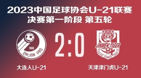6月6日讯 中超U21联赛总决赛第五轮,大连人U21以2-0击败天津津门虎U21,赵佳楠、俸泽源分别为球队取得进球。
