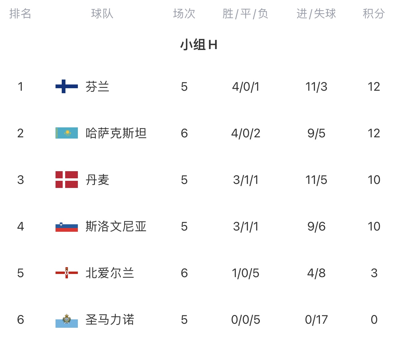 9月10日讯 欧洲杯预选赛H组第6轮,哈萨克斯坦主场1-0击败北爱尔兰,积分追平芬兰,超越丹麦,暂时升至小组第二。