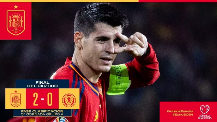 10月13日讯 北京时间10月13日凌晨2:45,欧预赛A组第7轮,西班牙坐镇主场迎战苏格兰。上半场梅里诺中柱,莫拉塔破门但越位在先被吹,罗伯逊伤退,西班牙暂时0-0苏格兰;下半场麦克托米奈任意球破门,但VAR介入,苏格兰球员亨得利越位位置干扰门将,进球无效,随后莫拉塔头球建功,桑塞特再下一城,西班牙2-0击败苏格兰,在少赛一场的情况下积分来到12分,还落后苏格兰3分。