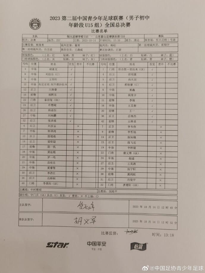 相关阅读:中国青少年足球联赛恒大足球学校U15山东泰山U15足球