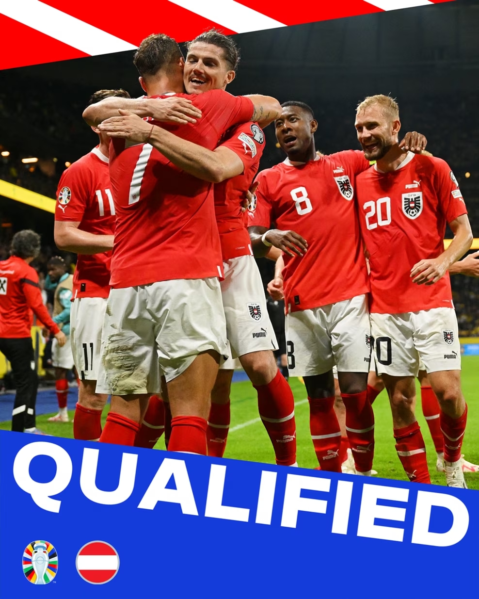欧预赛F组,比利时6轮16分、奥地利7轮16分,两队都晋级欧洲杯正赛,接下来将竞争小组第一。