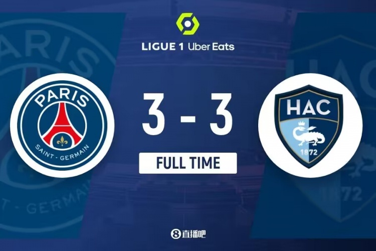 全场比赛结束,最终巴黎圣日耳曼3-3勒阿弗尔。