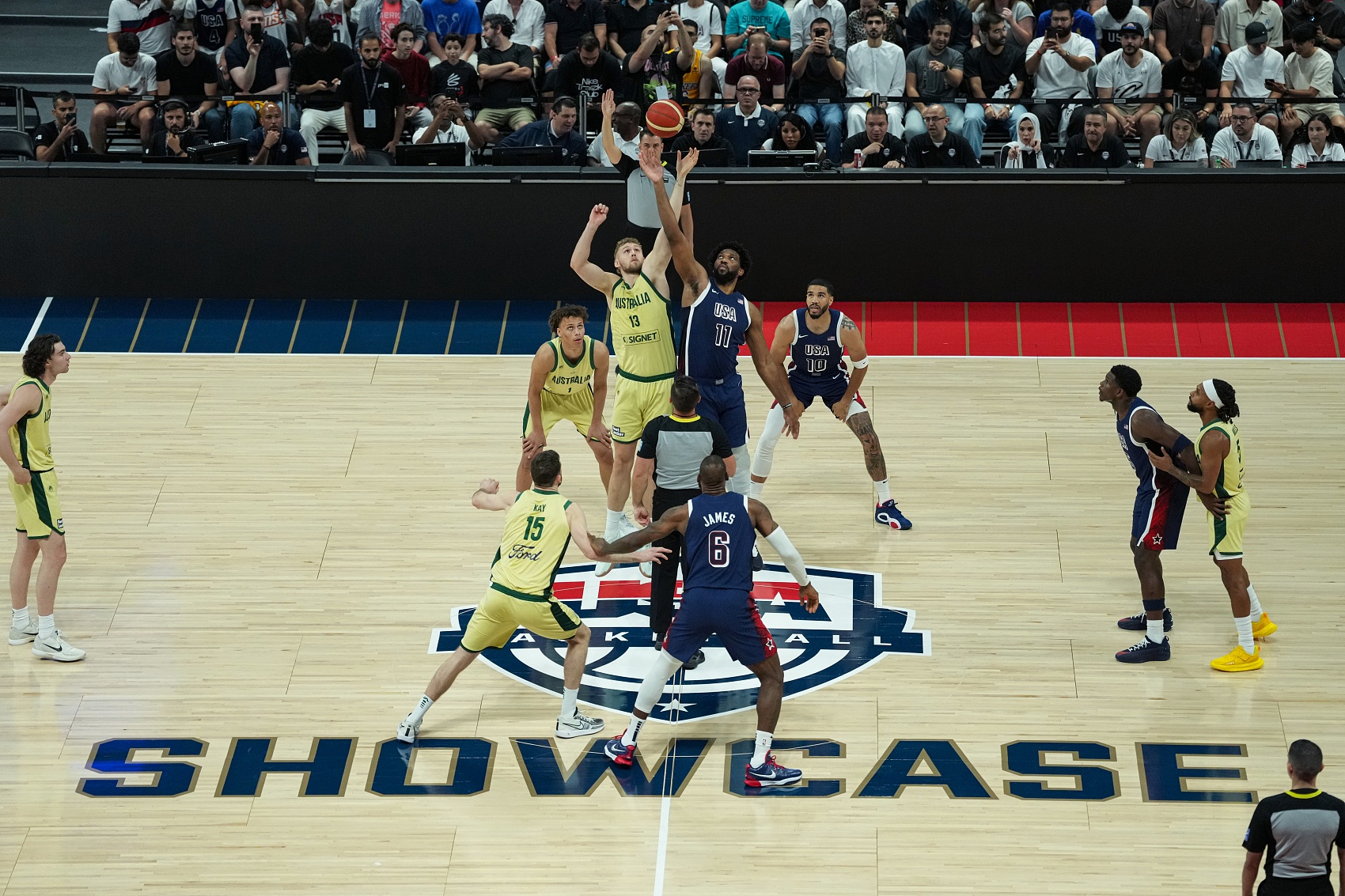 比赛开始,兰代尔里突外投为澳大利亚包揽前5分,詹姆斯连续扔进三分回应,爱德华兹连中3记三分连砍11分,双方展开对攻战,美国队接连反击首节领先11分,次节美国队接连3记中投拉大领先,澳大利亚接连突破止血,库里三分回应后恩比德里突外投连续砍分,半场美国队继续领先16分。下半场,美国队上来13-4攻击波直接拉开20分以上领先,澳大利亚接连暴扣10-0迅速止血追分,爱德华兹和恩比德接连2+1止颓,三节美国队还领先15分,末节双方继续对攻战,詹姆斯联手浓眉有内有外掌握住领先优势,但美国队接连失误,米尔斯三分终于开和追到个位数分差,哈利伯顿接连三分紧急止血,布克中投杀死比赛,最终美国男篮98-92战胜澳大利亚男篮。