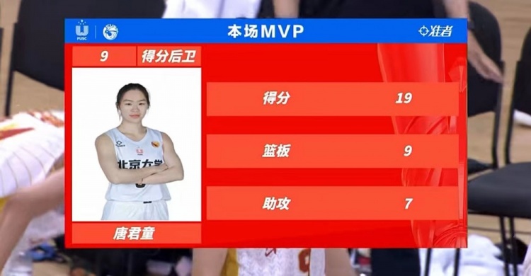 北京大学:唐君童19分9板7助3断2帽,王家绘13分12板6助,李美潼8分5板5助,王滢6分6板,王雨桐9分