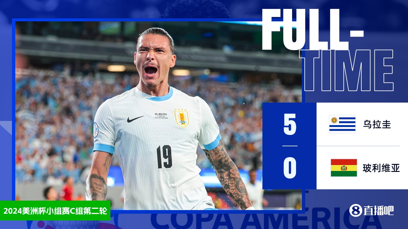 6月28日讯 北京时间6月28日上午9:00,美洲杯C组第2轮,乌拉圭对阵玻利维亚。上半场,佩利斯特里头球建功,努涅斯连场破门后中框。下半场,马克西米利亚诺-阿劳霍、巴尔韦德先后进球,本坦库尔替补得分。全场结束,乌拉圭5-0玻利维亚。