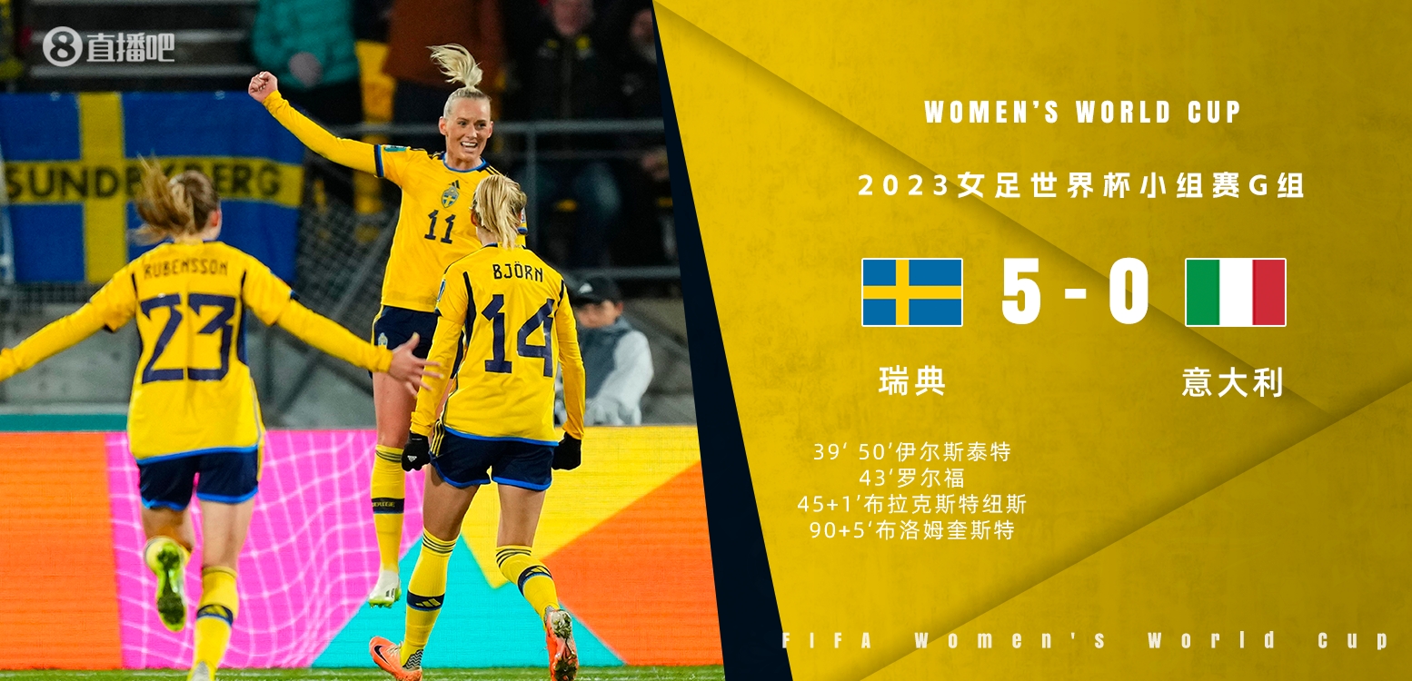 直播7月29日讯 北京时间7月29日下午15:30,女足世界杯G组第2轮,瑞典女足对阵意大利女足。上半场,瑞典女足7分钟内连入三球。下半场,伊尔斯泰特头球双响,布洛姆奎斯特终场前单刀得手。全场结束,瑞典女足5-0意大利女足。本场过后,瑞典积6分提前出线,意大利积3分排名第2,南非和阿根廷各积1分,分列三、四位。