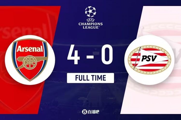 全场比赛结束,阿森纳4-0埃因霍温。