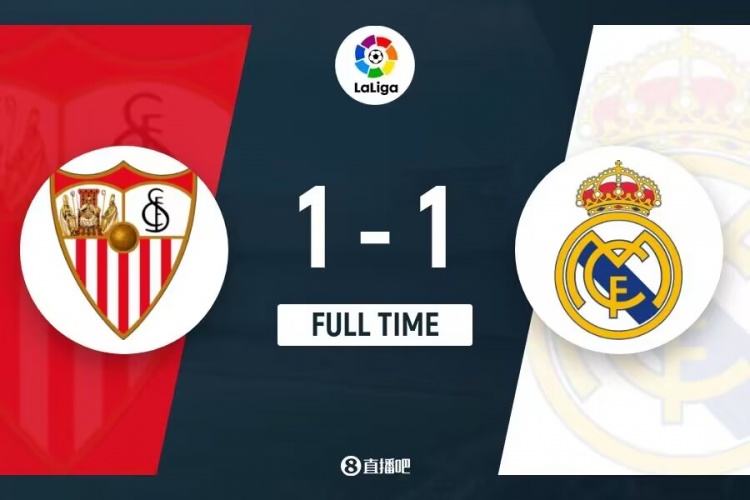 下半场伤停补时7分钟,全场比赛结束,最终皇马1-1塞维利亚。