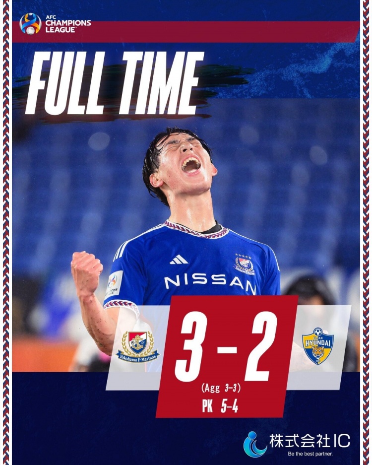 4月24日讯 北京时间4月24日晚上18:00,亚冠半决赛次回合,横滨水手主场迎战蔚山HD。上半场,植中朝日双响,安德森-洛佩斯破门,马修斯头球扳回一城,上岛拓巳吃红点套餐,博哈尼奇点射。下半场,双方均无建树。加时赛,凯尔文中框,金敃友绝杀越位。点球大战,金敃友失点。全场结束,横滨水手点球总分8-7险胜蔚山HD,晋级亚冠决赛。决赛将由艾因对阵横滨水手。