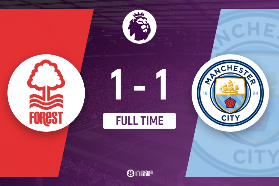 全场比赛结束,曼城1-1战平诺丁汉森林。