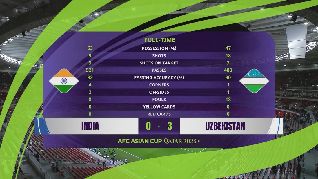 第4分钟,舒库罗夫头球摆渡,费祖拉耶夫头球接力破门,乌兹别克斯坦打入本届赛事球队首粒进球,1-0领先印度↓