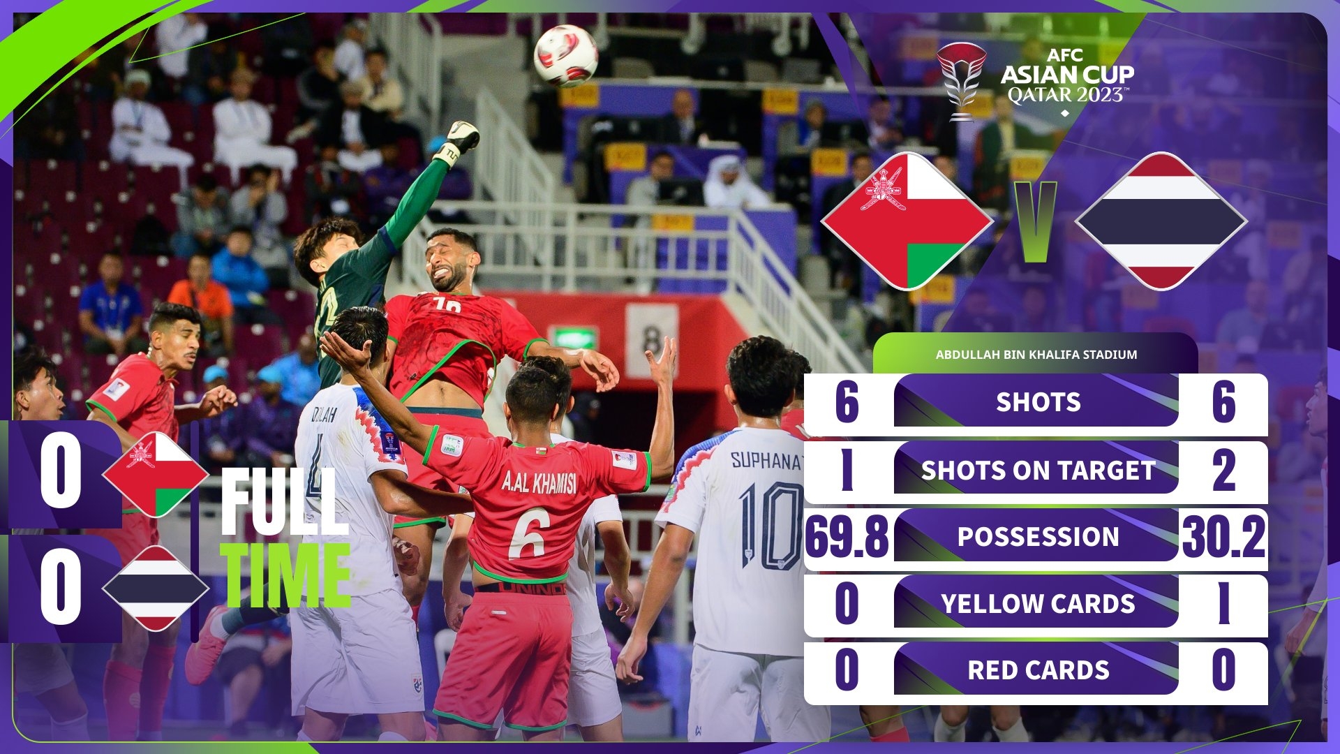 1月22日讯 北京时间22:30,亚洲杯小组赛第二轮,阿曼vs泰国。上半场泰国队威胁头球被门线解围,下半场巴提瓦关键扑救,最终泰国0-0阿曼。泰国队先赛一场继续位居小组第一,末轮将对阵沙特。