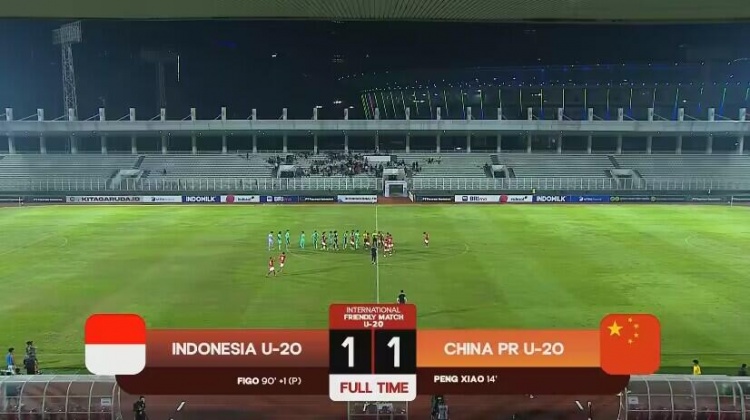全场比赛结束,U19国青1-1战平印尼。