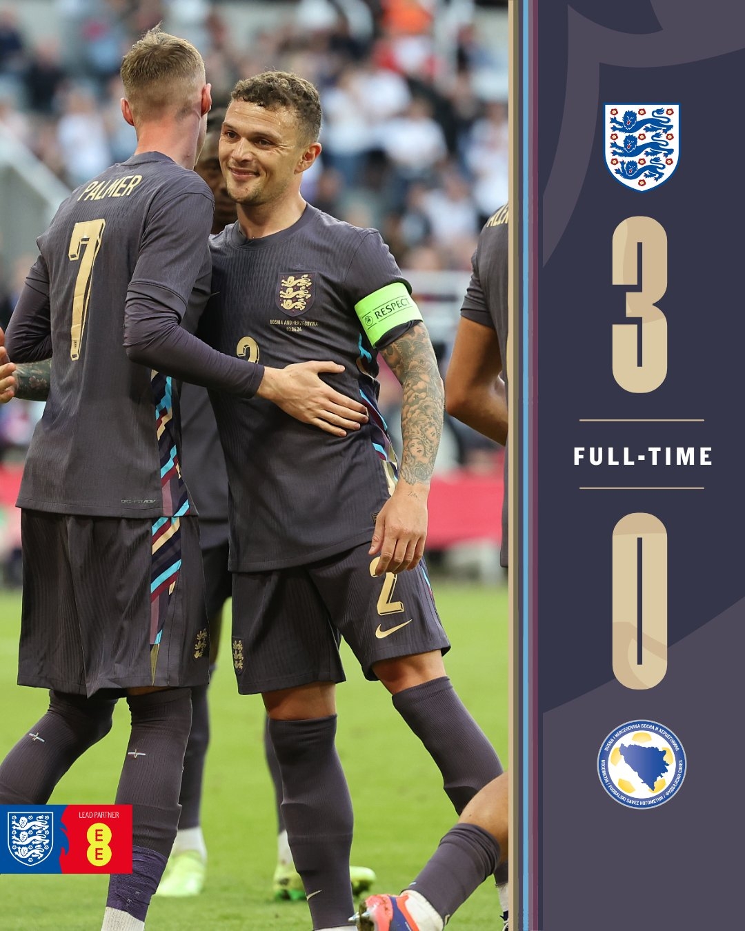 6月4日讯 北京时间2:45,友谊赛英格兰vs波黑。上半场,双方都机会寥寥。下半场,孔萨禁区内被拽倒,帕尔默点射破门,打进英格兰队处子球!格拉利什助攻,阿诺德小角度超帅凌空斩!凯恩补射破门锦上添花!最终,英格兰3-0击败波黑。在欧洲杯前,英格兰还有一场与冰岛的友谊赛。