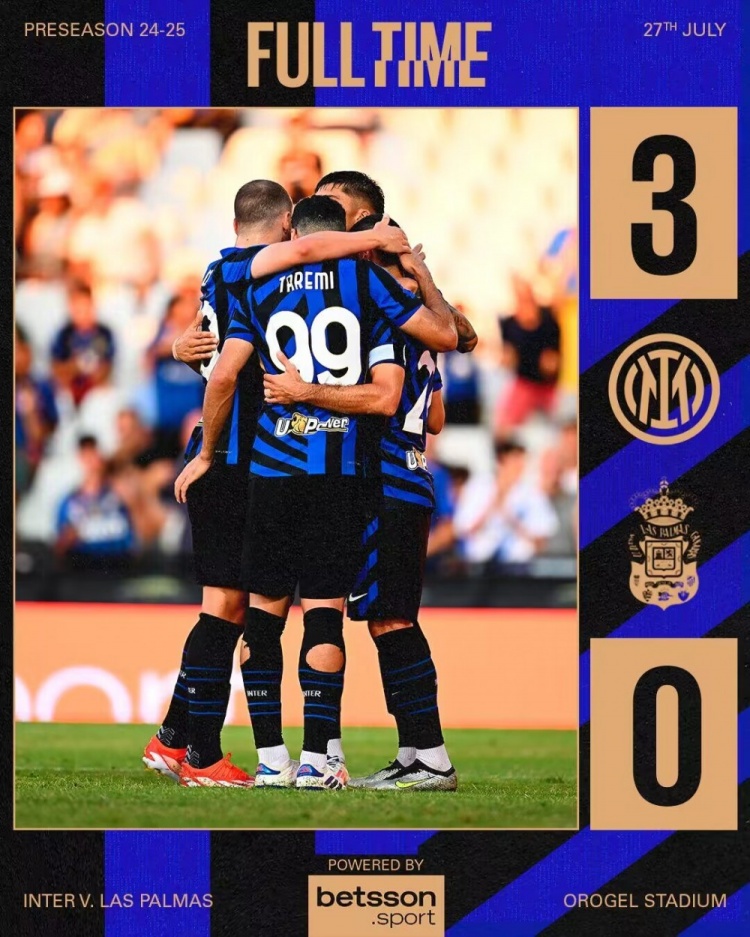 7月28日讯 北京时间7月28日凌晨1时30分,2024年足球友谊赛展开角逐,国际米兰对阵拉斯帕尔马斯。上半场塔雷米造点&梅开二度,3场热身赛攻入5球,下半场弗拉泰西失单刀,迪马尔科吊射破门。最终国际米兰3-0完胜拉斯帕尔马斯,国米取得热身赛3连胜,下场将迎战意乙球队比萨。
