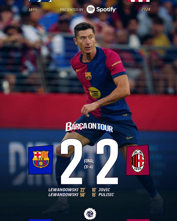 8月7日讯 北京时间7:30,季前友谊赛巴塞罗那vsAC米兰,上半场,普利西奇助攻约维奇破门,随后自己极小角度再下一城完成传射!莱万弧顶兜射扳回一球;半场补时阶段,维克托破门被吹。下半场,莱万包抄完成双响。最终AC米兰2-2战平巴萨,季前赛对阵城皇萨2胜1平;巴萨季前赛1胜2平。