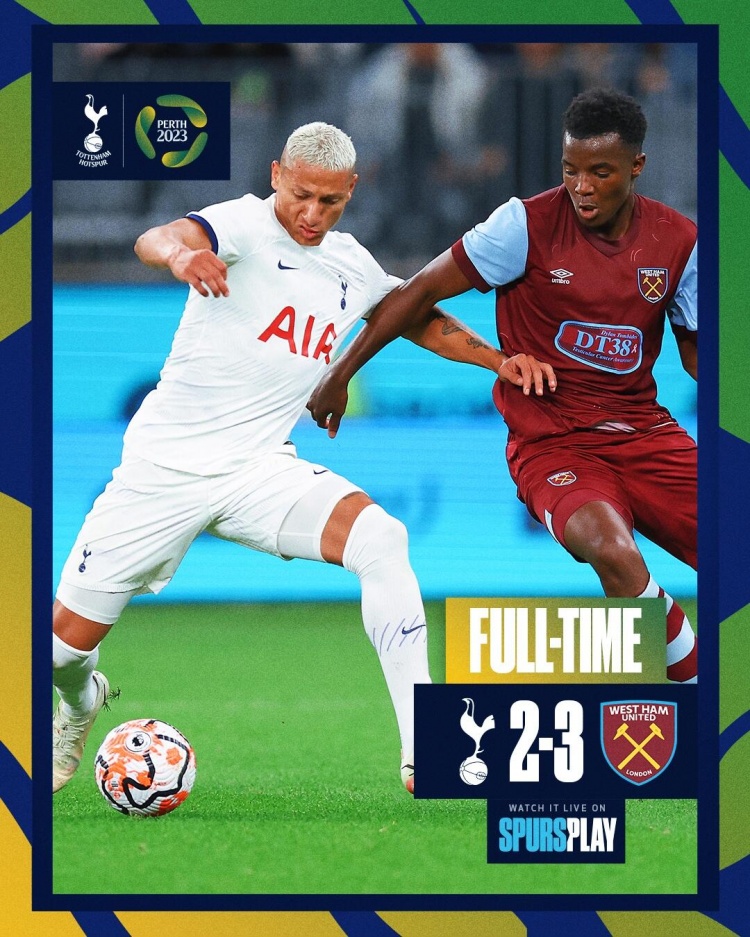 7月18日讯 今晚18点,友谊赛,热刺对阵西汉姆。上半场英斯、穆巴马先后头槌破门。下半场热刺更换全部球员,洛塞尔索、乌多吉3分钟连进2球扳平,斯卡马卡为西汉姆再次超出比分。最终热刺2-3西汉姆。