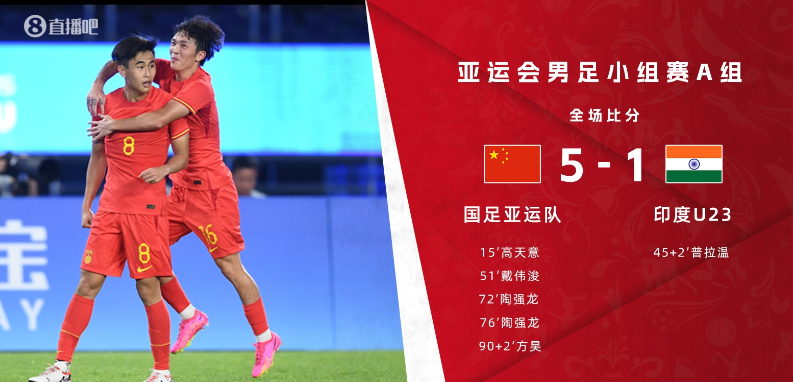 直播9月19日讯 北京时间9月19日晚上19:30,亚运男足小组赛首轮,中国迎战印度。上半场,高天意首开记录,谭龙造点朱辰杰失点,印度压哨扳平。下半场,戴伟浚世界波,陶强龙梅开二度,方昊传射。全场结束,中国5-1印度,取得小组赛开门红。中国下一战的对手是缅甸U23,双方将在9月21日19:30进行较量。