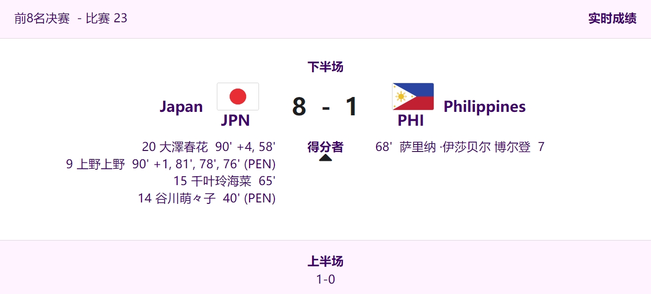 9月30日讯 亚运会女足1/4决赛,日本女足8-1横扫菲律宾女足挺进4强,半决赛他们将对阵中国女足。