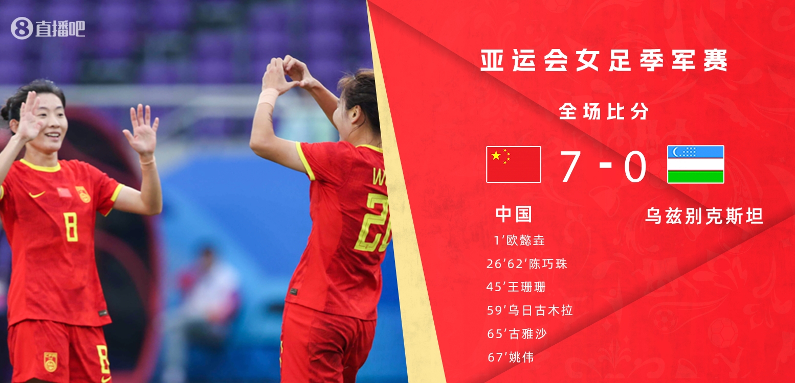 10月6日讯 北京时间10月6日15:00,亚运女足季军战中国女足迎战乌兹别克斯坦女足的比赛,上半场第21秒欧懿垚头球闪击得手,陈巧珠单刀破门,王珊珊爆射建功,半场结束,中国女足3-0乌兹别克斯坦女足。下半场乌日古木拉头球建功,陈巧珠头球完成双响,古雅沙替补建功,姚伟抽射扩大比分,最终中国女足7比0大胜乌兹别克斯坦女足取得铜牌,中国女足亚运以4胜1负的成绩收官。