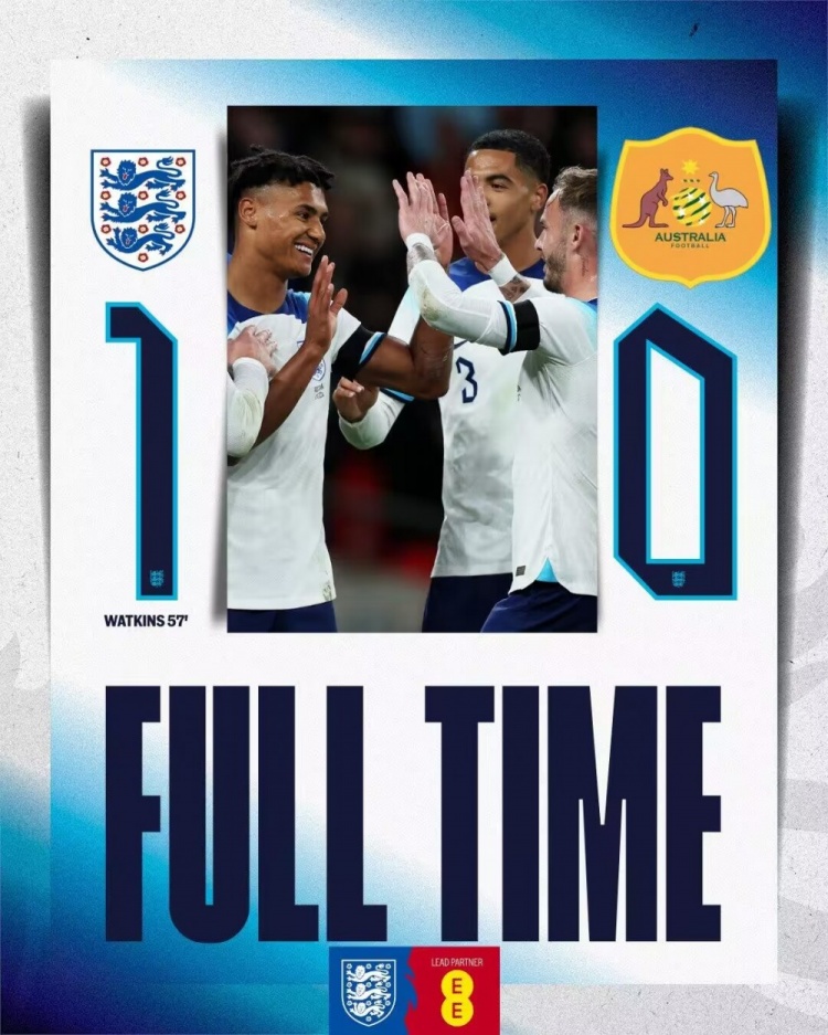 10月14日讯 国际友谊赛,英格兰主场vs澳大利亚。上半场,沃特金斯单刀中柱。易边再战,沃特金斯铲射破僵。最终英格兰1-0澳大利亚。